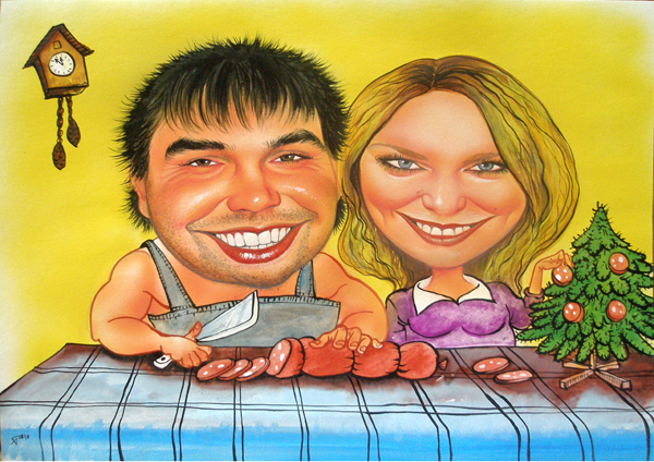 дружеский шарж. Посудите сами. В шутливом исполнении художника и муж, и жена будут представлены в образе, невольно вызывающем улыбку. По большому счету, Вы подарите на Новый год в дом знакомой семейной паре настоящий климат – контроль, регулирующий погоду в доме! Только кто-то из супругов захочет сказать резкое слово партнёру, только рассердится чего-то, а тут глянет на смешную картину, увидит своего любимого в смешном виде, улыбнётся, и где весь негатив денется! Не стоит колебаться! Заказывайте в подарок шаржи!